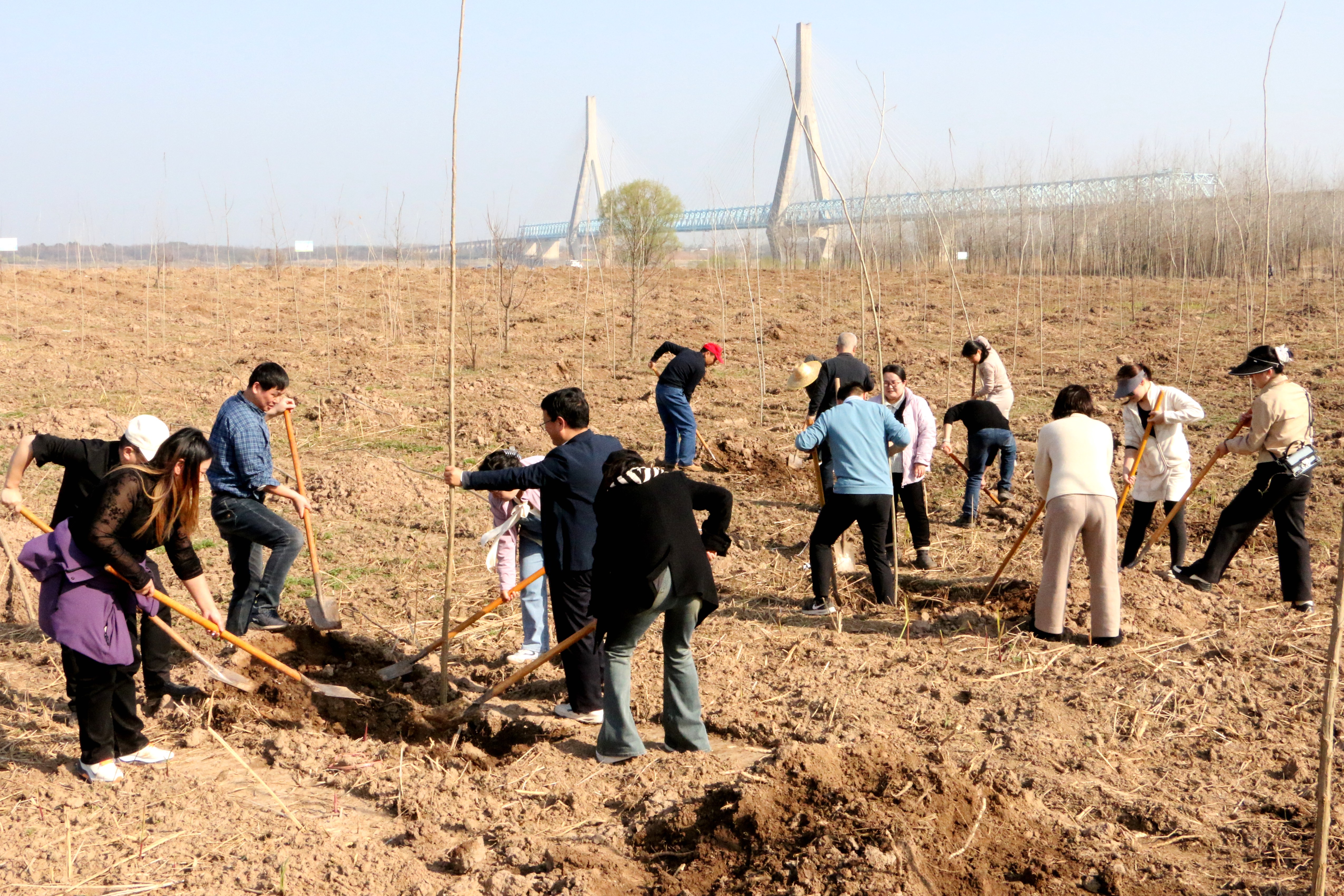 15时许,党员们抵达植树点后便三五成群投入到紧张的劳动中,大家热情高涨、干劲十足,分工协作、默契配合,有的挥锹铲土,有的扶苗填坑,有的踏土夯苗,有的提水浇灌,经过一个多小时的辛勤劳作,几十株新栽种的丹红杨迎风挺立、错落有致,为长江岸线再添了新绿。