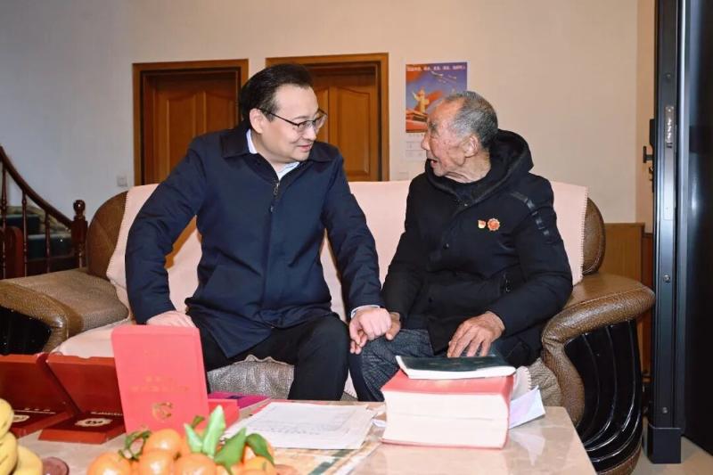 2月10日,省委书记梁言顺在安庆市岳西县天堂镇,登门看望97岁老党员、退役军人方武根,与老人促膝长谈。